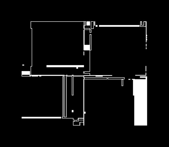 Al introducirnos en este nuevo escenario, completamente pintado de negro, envolvente y denso, nos referenciamos mediante unos trazados representados en los muros que, a modo de planos, sugieren nuevos e imaginarios espacios.